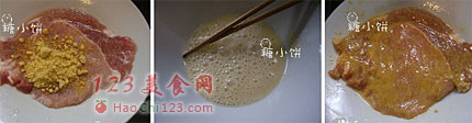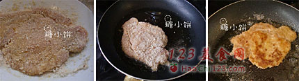 9、至肉片两面金黄的时候一般就已经熟透了,如果你的肉片比较厚,中途开一段时间的中小火便于它成熟,当然也可以用炸的,煎的比较省油嘛。