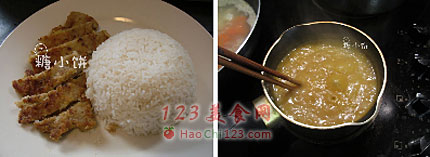10、煮熟的米饭压入碗中,倒扣出来就完成小山包的形状了,煎好的猪排切块,码在盘子里。