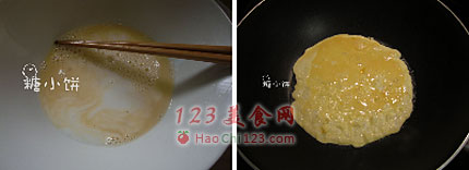 13、不粘锅里刷一层底油,倒入蛋液煎成蛋皮,煎好的蛋皮扣在米饭上,上面浇一层步骤11准备好的咖喱酱即可。