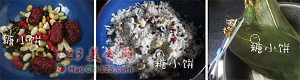 2、糯米也提前泡软沥去多余水分,取2杯(1杯=240ML)泡好的糯米加上泡好的各种杂粮还有2汤匙白砂糖拌匀,糯米我是一次性泡了很多,有些用来包了白米粽,所以此处参考量是按照泡过之后的量算。
