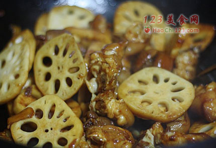3、再加入酱油、黄酒、冰糖等调料,炒匀,最后加入莲藕炒匀。