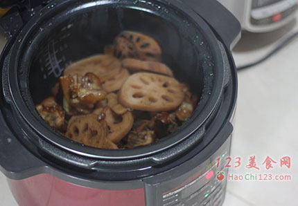 4、把翻炒好的莲藕和猪蹄一起放进电压力锅里,完成打开盛碟即可上桌。