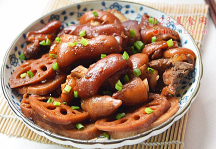 2、莲藕含有黏液蛋白和膳食纤维,能与人体内胆酸盐,食物中的胆固醇及甘油三酯结合,莲藕散发出一种独特清香,能促进消化、健脾止泻,开胃健中;富含铁、钙等微量元素,能补益气血,有效增强人体免疫力。猪蹄含有较多的蛋白质、脂肪、碳水化合物,并含有钙、磷、镁、铁及维生素A、D、E、K等成份,特别是蹄皮、蹄筋含有丰富的胶原蛋白,能改善机体生理功能。