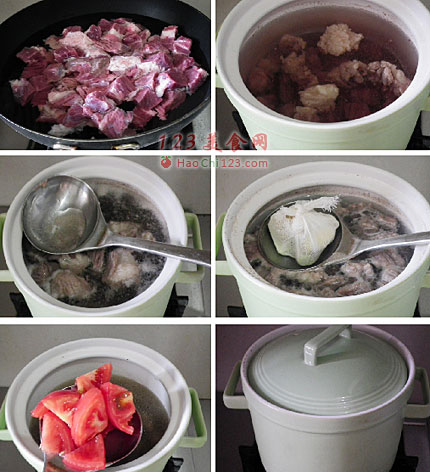 9、中火烧开,在微开的时候用勺子撇去血沫。
