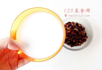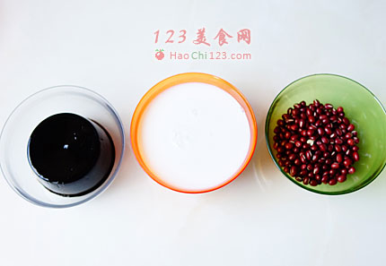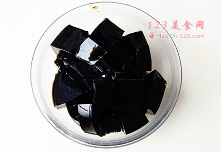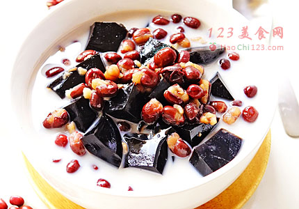 6、把龟苓膏放碗里,冰箱里拿出冻好的蜜豆就完成了,还加上椰奶,还别有风味。