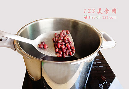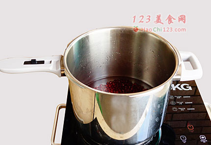 2、红豆泡一个小时,倒压力煲里,加入水,加盖上压后10分钟,下压即可。
