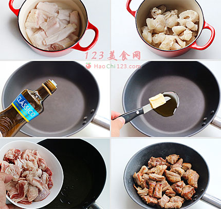 3、牛筋焯水去除杂质,煎锅加一汤勺橄榄油与少许黄油,将牛腩煎至双面微焦。