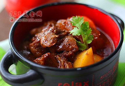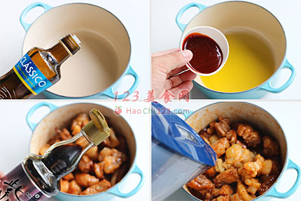 4、锅中加入2汤勺橄榄油,加入海鲜酱炒香加入牛腩与牛筋翻炒上色,加入少许酱油调味,加入清水,水量没过牛肉即可。