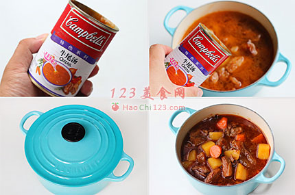 5、烧开后加入半罐金宝汤的牛尾汤,盖上盖子最小火烧3小时,然后加入土豆与胡萝卜中火烧15分钟即可。