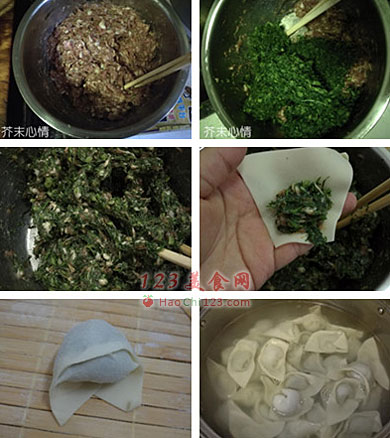 2、茴香洗净切末加入食盐揉搓至大量出水,挤去水分加入猪肉馅中搅拌均匀。