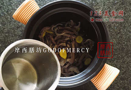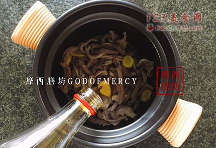 3、猪肚比较难煮的熟烂,最好先炖一小时。加入花雕酒。