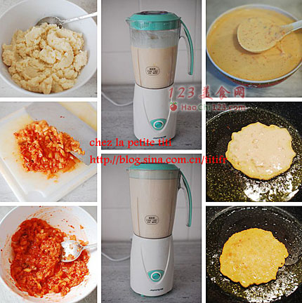 3、泡菜饼有两种煎法,一是煎小圆饼的形状,这个比较好控制,翻面的时候也不容易翻烂;二是像韩国传统的泡菜煎饼那样,煎一个大圆饼,这种煎法难度稍高,特别是翻面饼时容易翻烂,不熟手的人可以借用另一个空的平底锅作为工具,两个锅倒来倒去,比拿铲子翻容易得多。
