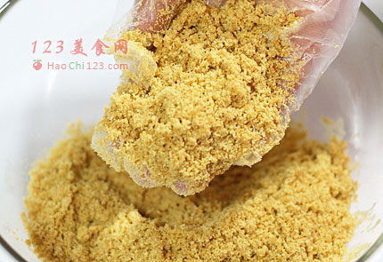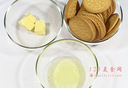 3、将饼干末和融化的黄油,蛋白用手混合均匀。
