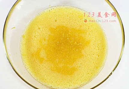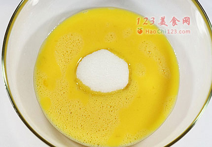 2、将细砂糖加盐和全蛋液,用打蛋器搅拌均匀。