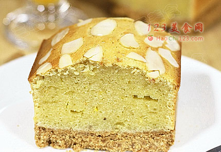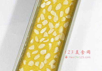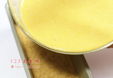 4、筛入低筋面粉和杏仁粉,用橡皮刮刀轻轻拌匀成面糊。倒在蛋糕底上。