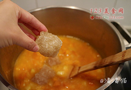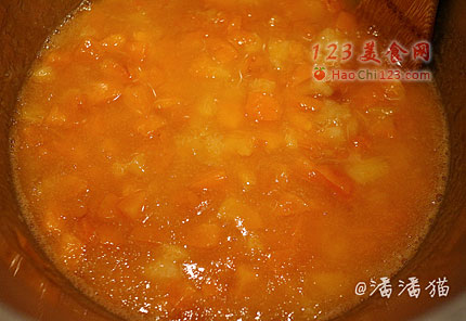 2、把杏肉放入锅中,开中小火,不用加水,一会儿杏肉就变成糊状了,自己出了很多果汁。