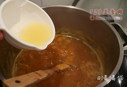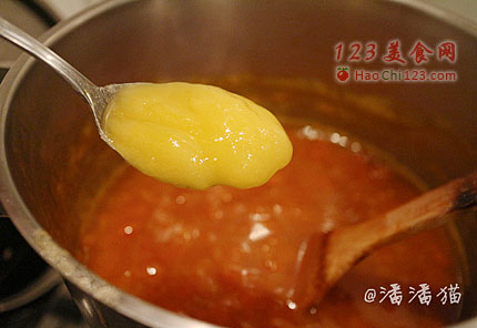 5、加入柠檬汁继续熬煮,熬到果酱略粘稠,果汁消耗了1/5。