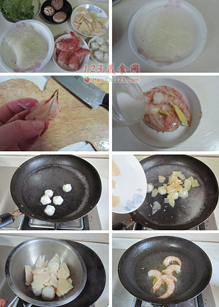 2、炒米粉注意食材的处理,如虾需去除虾线后腌制入味,再提前煎一下;而鱼丸和笋片都要焯烫一下;香菇切成片和生菜洗净就可以了。