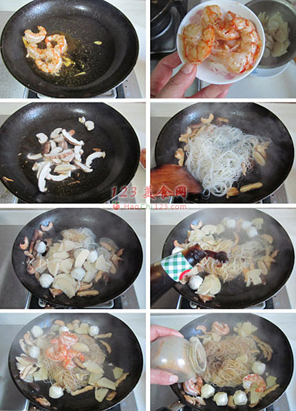 3、用煎过鲜虾的油来炒米粉最合适不过了,先炒香菇片,再加入米粉,鱼丸和笋片等;台湾炒米粉喜欢用台湾特制的酱油膏,如果没有,加入点蚝油来提味;虾比较鲜嫩,不适于炒长时间,放在后面放。