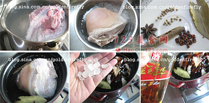 3、隔夜后的蹄膀开火煮滚,滚后加入洋葱块转小火续煮约1小时(肉汁备用)。