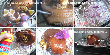 4、作法3的猪脚捞出后放在铺好洋葱丝的烤盘上,表面刷适量甜辣椒酱,接着放入预热好的180度C烤箱中烤约20-22分钟。