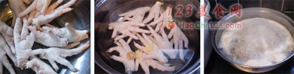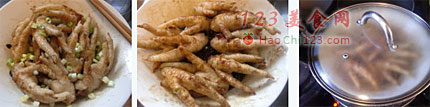 3、起油锅,下鸡爪子半煎半炸至表面微微起泡(没舍得开大油锅炸,所以就不指望炸出虎皮了)。