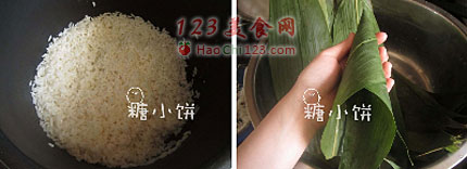 2、干粽叶提前用清水泡软,剪去硬的那部分叶梗,卷成一个锥形筒,不同于普通做法的地方是细锥形要卷两圈,这样子就会卷出比较细长的形状(如图示)。