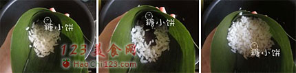 3、填入一部分糯米,轻轻压实。