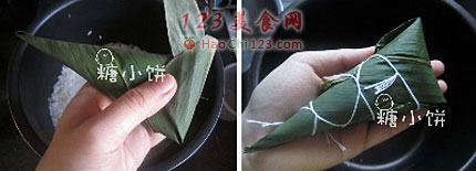 7、扎好煮熟即可(我用高压锅上汽后30分钟),当时没有粗棉绳,只能用缝衣服那种细线来捆,感觉使不上劲,扎不紧,所以手欠就多捆了几圈,捆成这蠢样,有稍粗点的棉绳的话在叶片翻折过来那个位置扎一圈就足够了,这种细锥形的捆很多圈并没有多大好处,可能会滑落的。