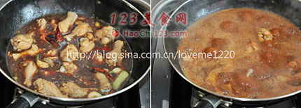 7、放入调好的碗汁,大火烧开,然后转小火,烧制10-12分钟。