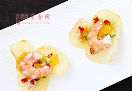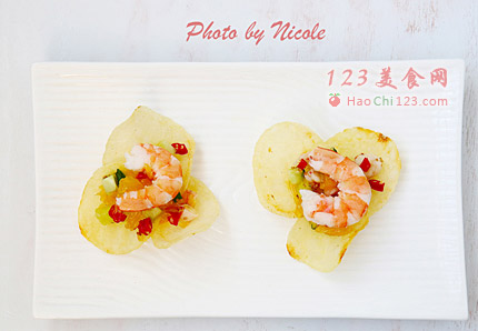 4、每3片薯片互相叠加做成一个沙拉盏,舀入适量沙拉,表面再装饰一个完整虾仁。