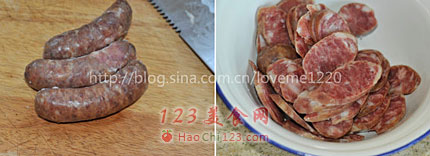 1、香肠要选择那种肉很多的,淀粉非常少的,这样才好吃,最好是有甜口的香肠。