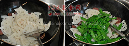 2、荷兰豆和莲藕要提前用水焯一下,断生,因为炒的时候这道菜非常快,也就1-2分钟就出锅了。