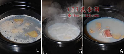 4、5、砂锅内加姜片和水,烧开后撇去浮沫。