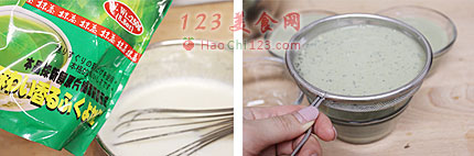 3、继而加入柠檬汁和过筛的抹茶粉,搅拌均匀。