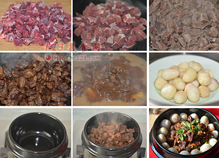 10、放入炖好的牛腱,再摆上蒸好的芋奶,浇上原汤,撒上青红椒碎和香菜即可。