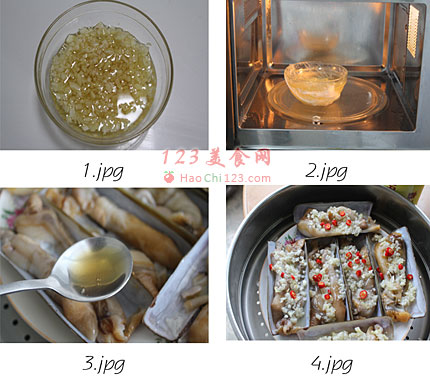 4、把姜蒜油铺到处理好的蛏子上,喜欢辣一点的口感的可以切点小红椒圈放上去。