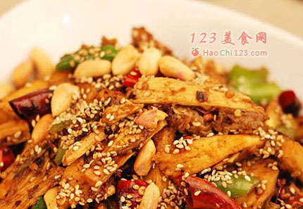 3、可根据个人口味调整花椒、辣椒用量,也可用孜然粉换掉花椒,起锅时加粗孜然粒就是烧烤口味的辣板筋了,味道也非常香。