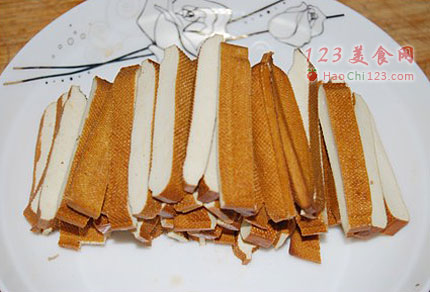 2、熏干切条备用。