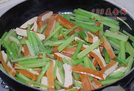 3、锅中加入色拉油,油热后倒入香芹翻炒至半熟加入熏干、盐一起翻炒,菜熟即可出锅。