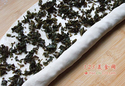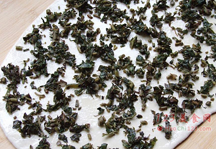 2、把腌制好的香椿碎均匀撒在涂油的面皮上。