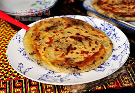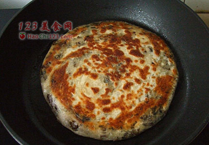 8、一面煎黄后翻面,继续烙至双面金黄,怕糊锅的话,中间多翻动几次,饼快烙好的时候,可以在锅子里摔打几次或者用硅胶铲子敲打,以便起层。做好的饼要趁热吃,凉了以后容易变硬。