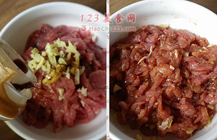 2、里脊肉中加入料酒、生抽、大蒜生姜碎拌匀。