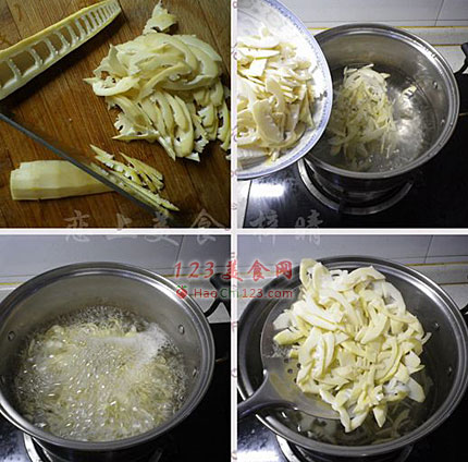 3、春笋斜刀切片,放入滚水中焯烫2分钟,捞出沥干水分备用。