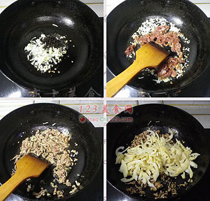 4、锅中放入适量油,放入豆豉碎、葱碎、蒜蓉炒香,放入腌制好的肉丝翻炒至变色,加入春笋翻炒均匀。