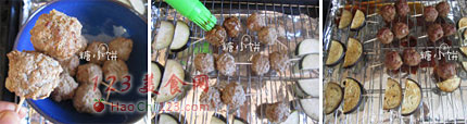 4、在所有丸子和茄子片表面刷上酱汁。
