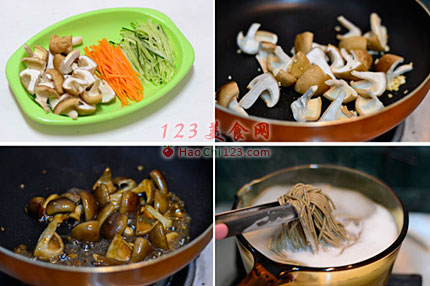 3、翻炒至菇类变软时调入适量生抽和蚝油,也可加入少许粉水炒至浓稠嫩滑,盛出备用。