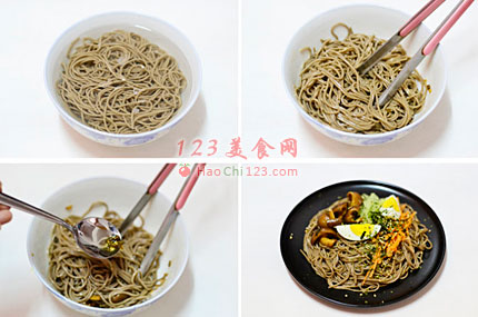8、将拌好的面条盛入盘中,放入滑菇,小黄瓜丝和胡萝卜丝,煮熟的鸡蛋对切成4小块加入,最后撒上适量海苔香松,食时搅拌均匀即可(或海苔碎,山药泥等,如你喜欢全部材料拌好后放入冰箱再冷藏会再食用更冰凉爽口)。