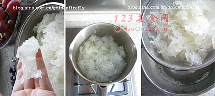 2、煮一锅滚水,将白木耳入锅中大火煮滚开后,转小火炖煮约20分钟后,关火焖1小时(要打成果汁,越软越好),后取出沥干待凉透。