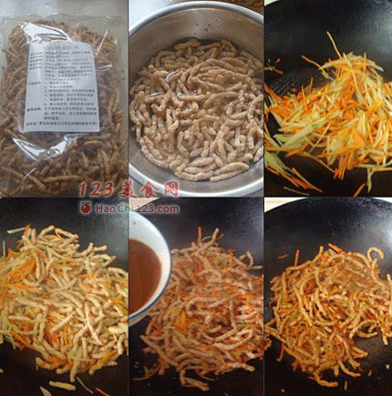 贴士:因为太着急了,盛到盘子里才想起来没有放盐,可儿子说味道正好,不用放盐了,我尝一下也觉得不用再放盐,可能是蛋白丝里本身含有盐分吧,如果口味重的可以少加点盐。为了更好体现出素食的独特味道,这个以假乱真的鱼香肉丝俺没有加红油豆瓣酱,事实证明,这样真的更突出了大豆拉丝蛋白原有的豆香味,越嚼越香。[LaoYanHuo.com]